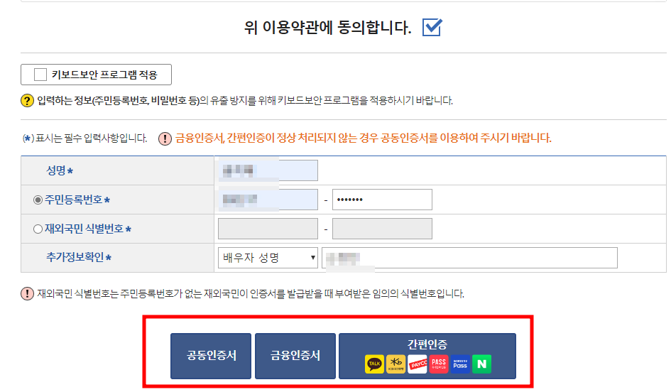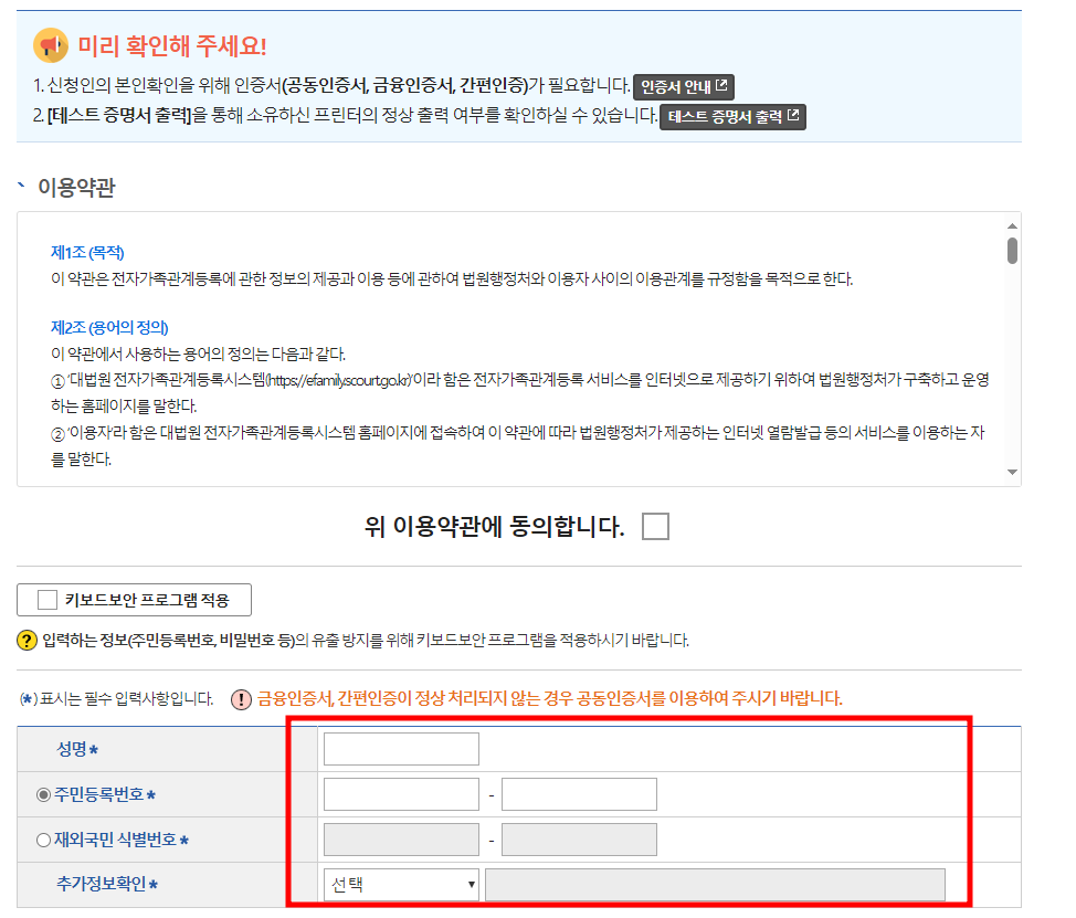 2. 아래 이용약관에 동의하고 본인 인적사항을 입력합니다.