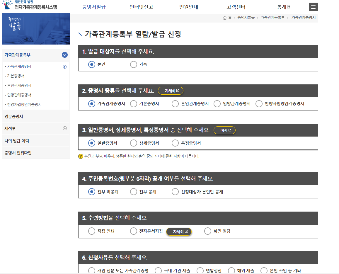 1. 아래 사이트에 접속하여 가족관계증명서를 클릭합니다.