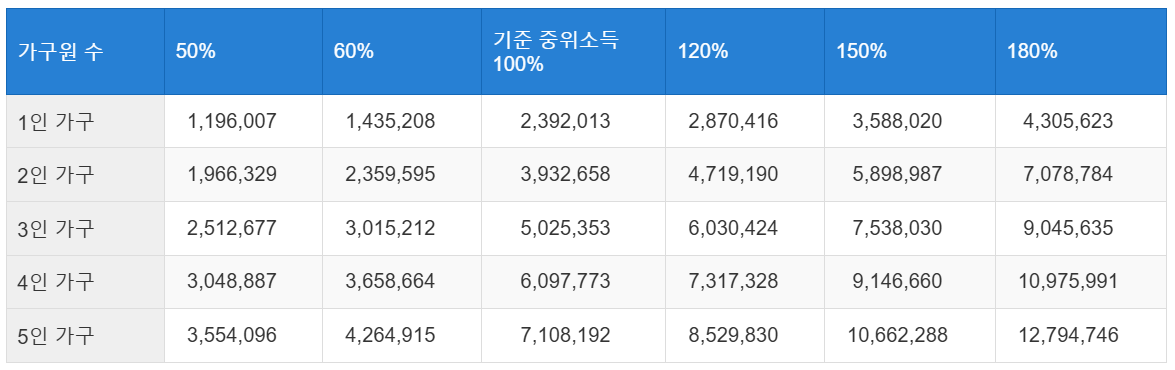 기준 중위 소득이란 전체 가구 소득을 순위별로 나열했을 때, 중간에 위치한 가구의 소득을 의미합니다.