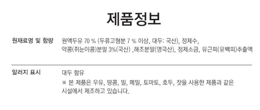 | 원재료명 | 대두, 정제수 외 다른 성분 없음 |