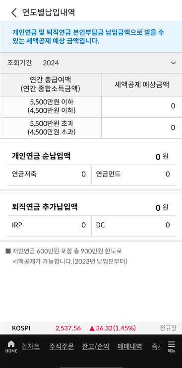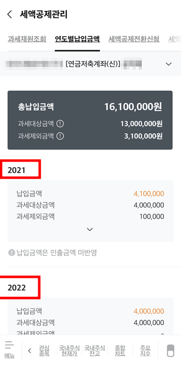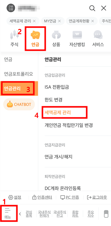 1) 어플 실행 후 아래와 같이 메뉴 -> 연금 -> 연금관리 -> 세액공제관리 화면으로 들어갑니다.