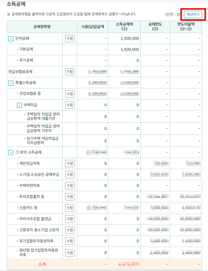 6. 소득공제의 계산하기를 누르면 금액이 뜹니다.