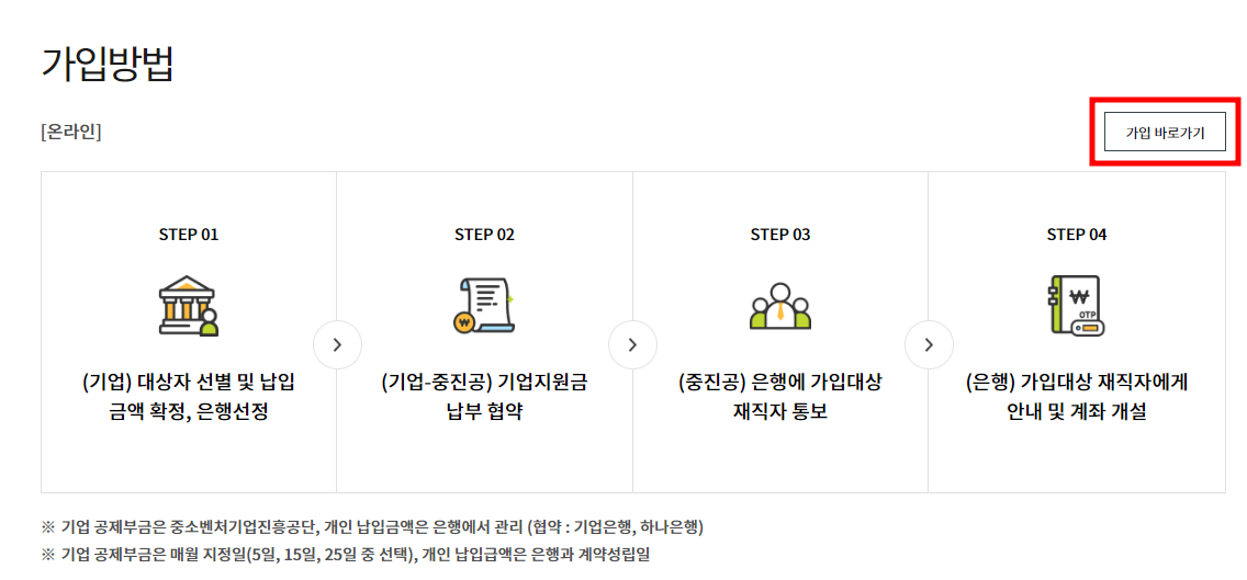 가입 전 근로자와 기업주는 납입 금액과 은행에 대한 사전 협의 후 아래 사이트를 통해 가입 신청을 합니다.
