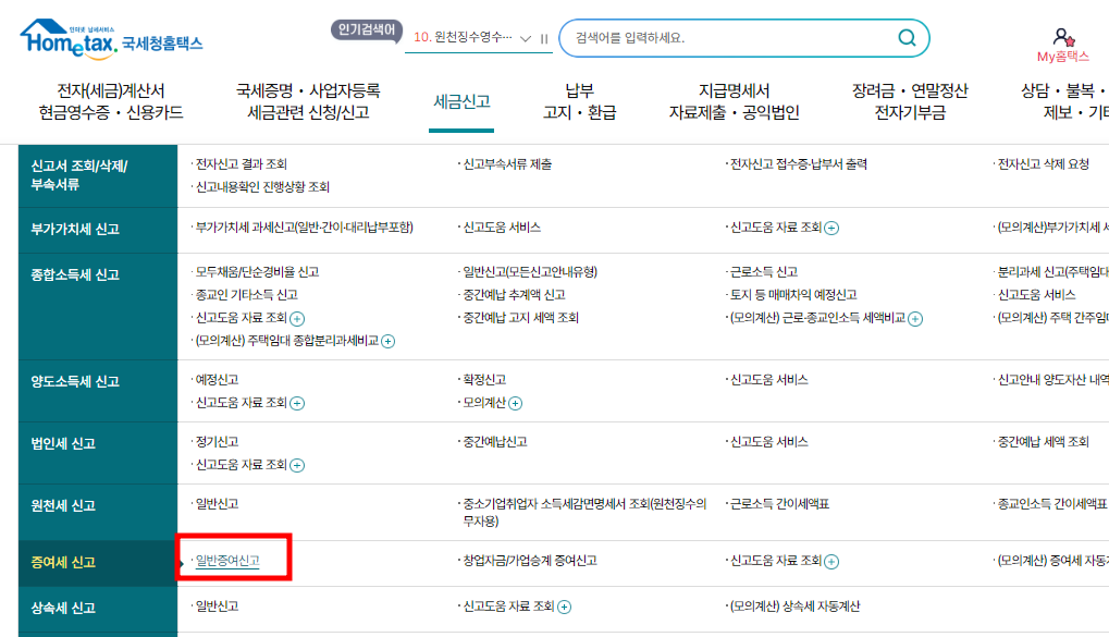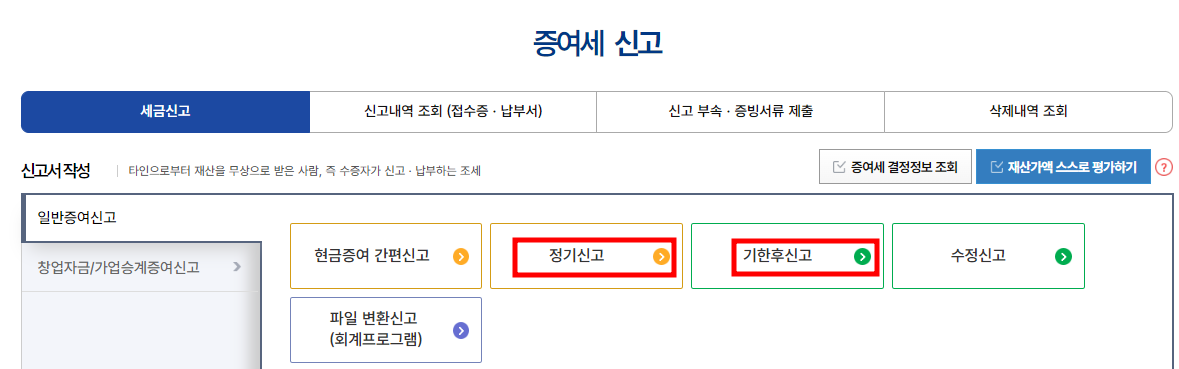 1. 홈택스 접속 - 세금신고 - 일반 증여 신고 - 정기 신고 or 기한후신고 선택