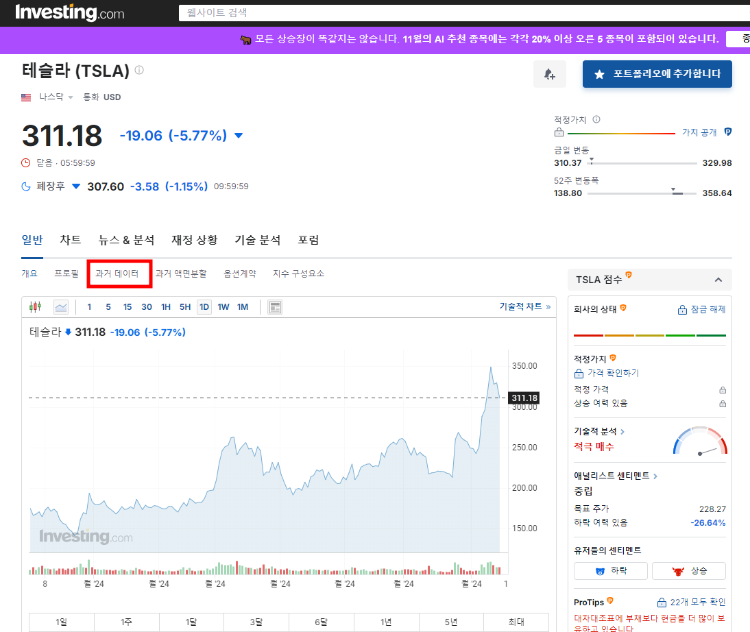 1. kr.investing.com에 접속하여 증여하려는 해외주식 종목을 검색하고 아래 화면과 같이 과거 데이터를 클릭합니다.