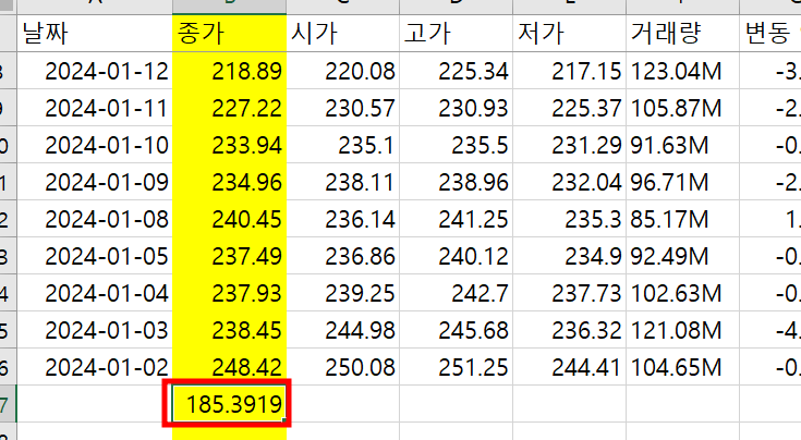 예시로 확인한 종가 평균 금액은 185.39 원으로 확인되는 걸 알 수 있습니다.