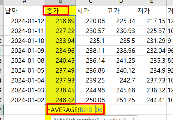 3. 종가평균금액은 average 평균 수식을 활용하여 평균 금액을 확인합니다.