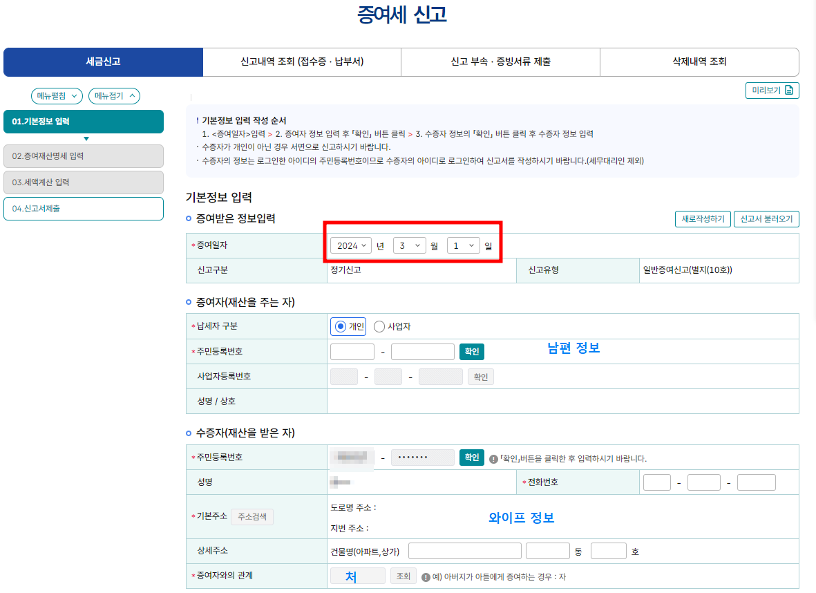 2. 증여일자를 선택하고 아래 화면에 맞게 내용을 입력합니다.